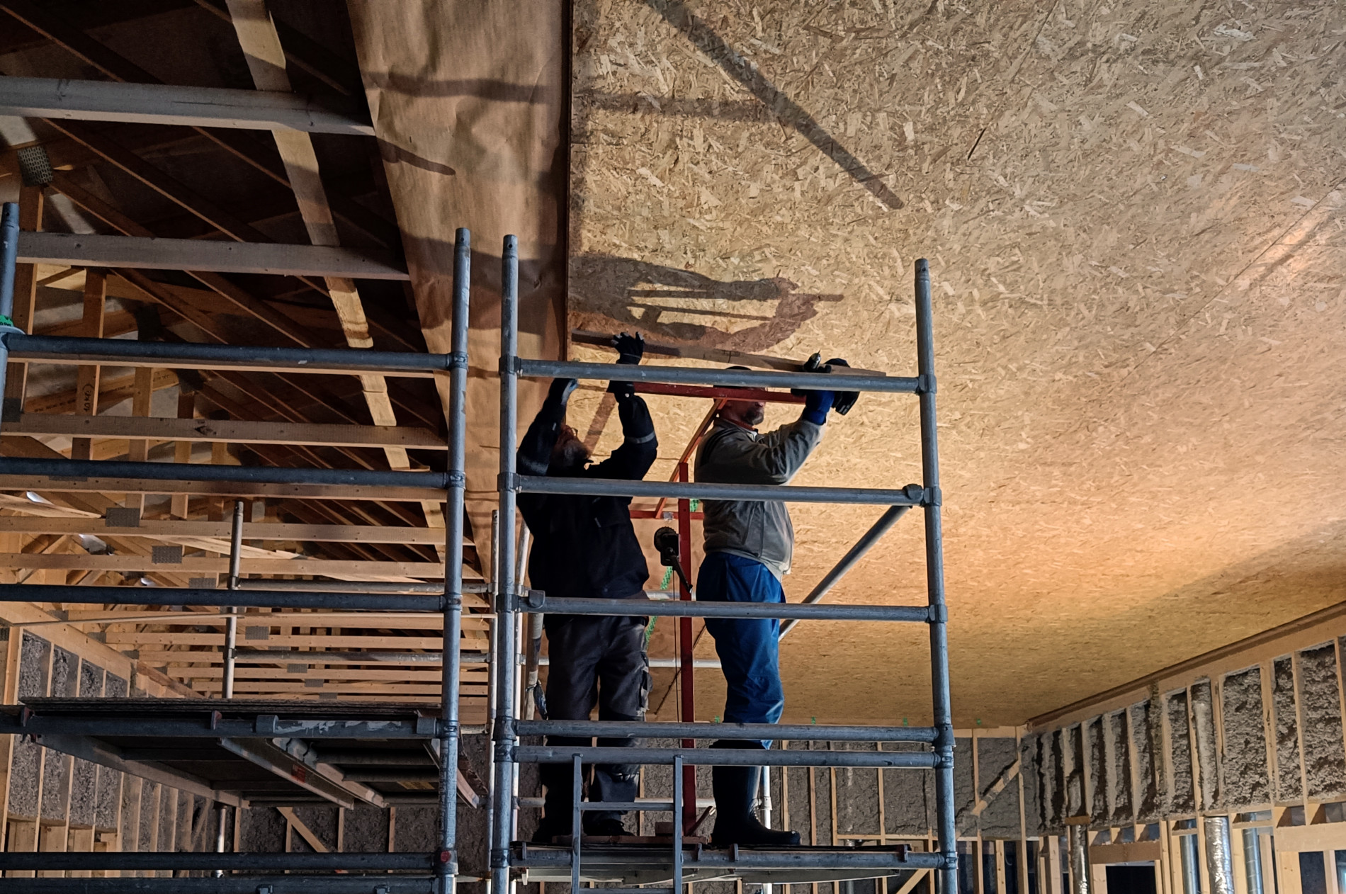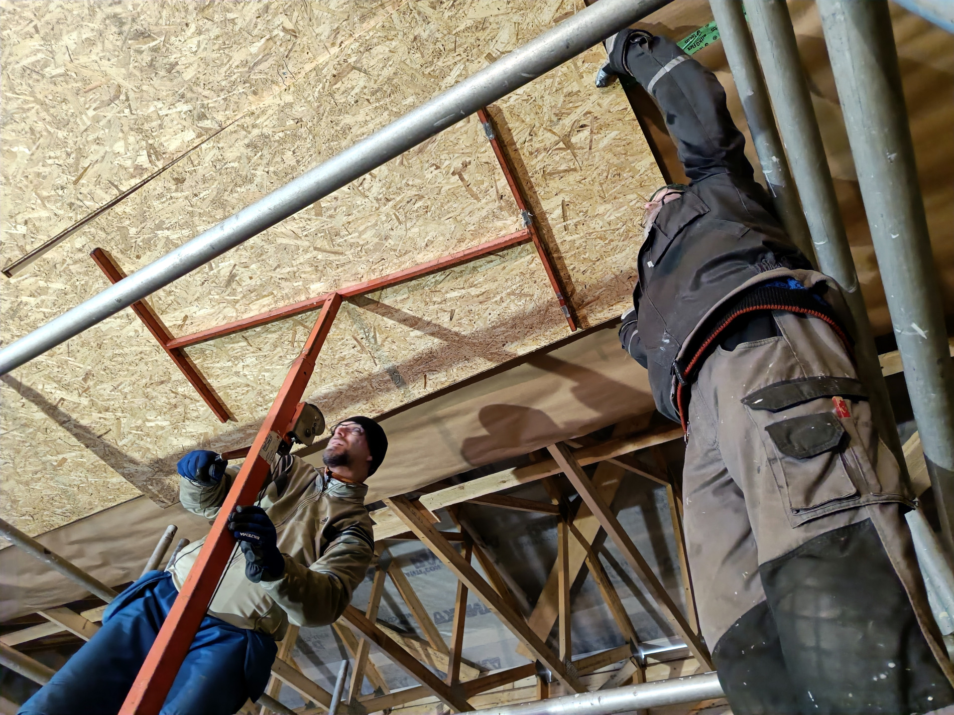 Kari ja Antti ovat päässeet korkeamman tason tehtäviin, eli asentamaan levyjä salin kattoon rakennustelineiden päältä.